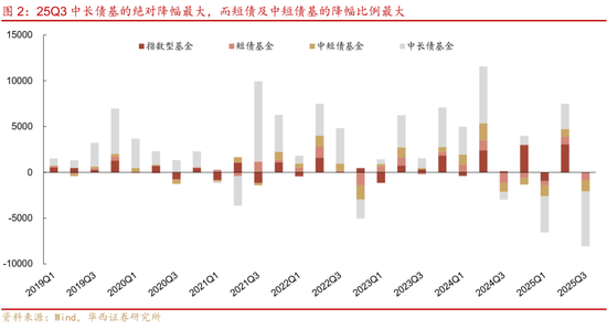 参考三季度的基金季报数据,截至2025年三季度末,中长债基、短债基金、中短债基、指数债基规模分别为6.35、0.46、0.47、1.50万亿元,季度环比规模降幅分别为5991、823、1216、45亿元,中长债基受到的直观冲击较为显著,而指数债基则体现出极强的韧性(包含科创债ETF发行的托举作用)。而从季度环比降幅来看,四者降幅分别为8.6%、19.7%、20.3%、0.3%,作为“流动性管理产品”的典型代表,短债基金与中短债基赛道受到的冲击更为严重。